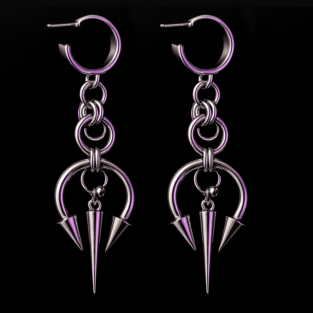 Venom Halo est une paire de boucles d’oreilles gothiques composées d’une chaîne de maillons, et d’une pointe conique encerclée par un sceptum détourné de son usage principal. Les éléments de ce bijou alternatif reprennent les codes du piercing, et les formes d’ornement propres aux styles gothiques, puck et rock.